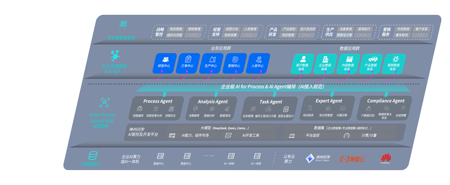 端到端的一站式AI工作空间深度融合了从企业战略规划到日常经营的全流程业务板块,,定向解决车企内部领域多、、部门多、、、链条长、、、场景碎片化等难题,,,支持车企快速构建以AI为核心的生产力写作体系,,,,实现任务执行与AI能力的无缝集成与交互