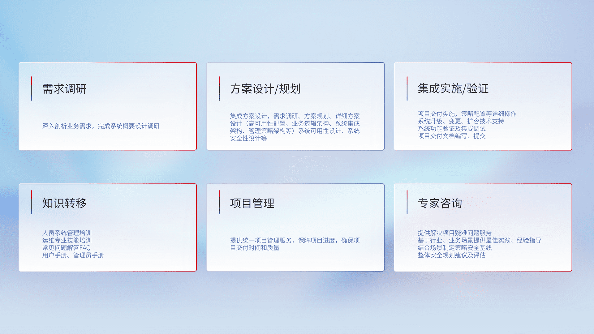 针对客户行业特性,,,,将宏观的安全战略和需求,,,通过专业的交付服务,,,,实现项目落地,,为客户提供标准规范的集成交付服务。。。。